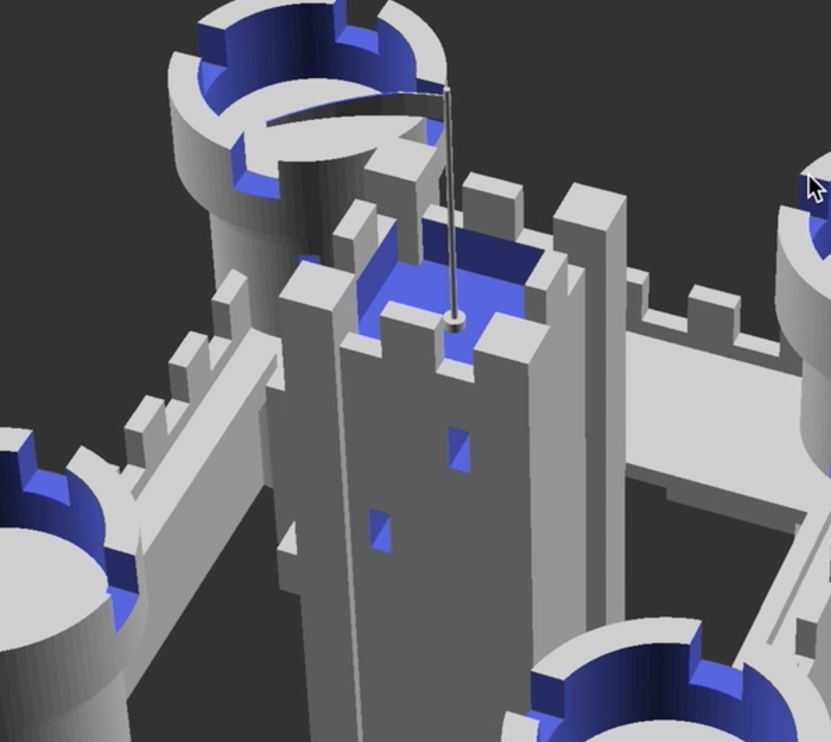 3-D design requires a lot of thinking about negative spaces. This simple castle has some details that can only be seen moving around it. Rendering in OpenSCAD.